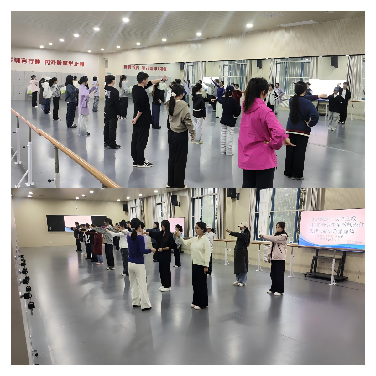 为夯实师范生职业核心素养,助力未来教师塑造专业形象,10月17日,“智圆名师”创新实验班在汉梁楼104实训室成功举办题为“以形载道,以身立教——师范专业学生教师形体实训与职业形象建构”的专项实训。本次活动由教师教育学院李鑫毅老师担任主讲,赵静老师主持,实验班全体学员全程参与。