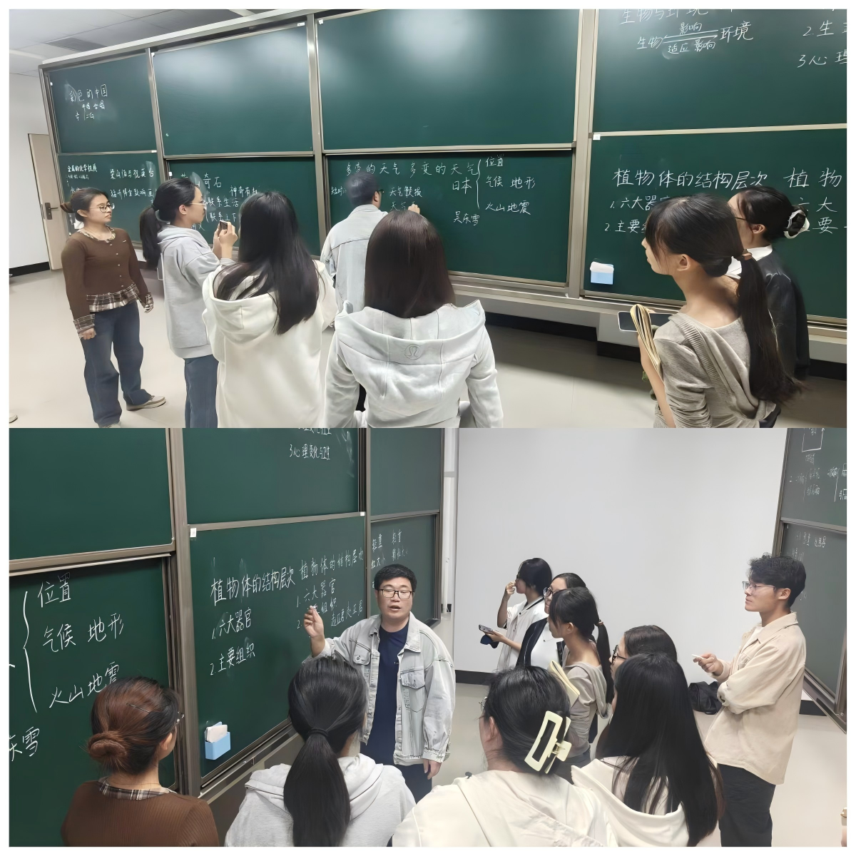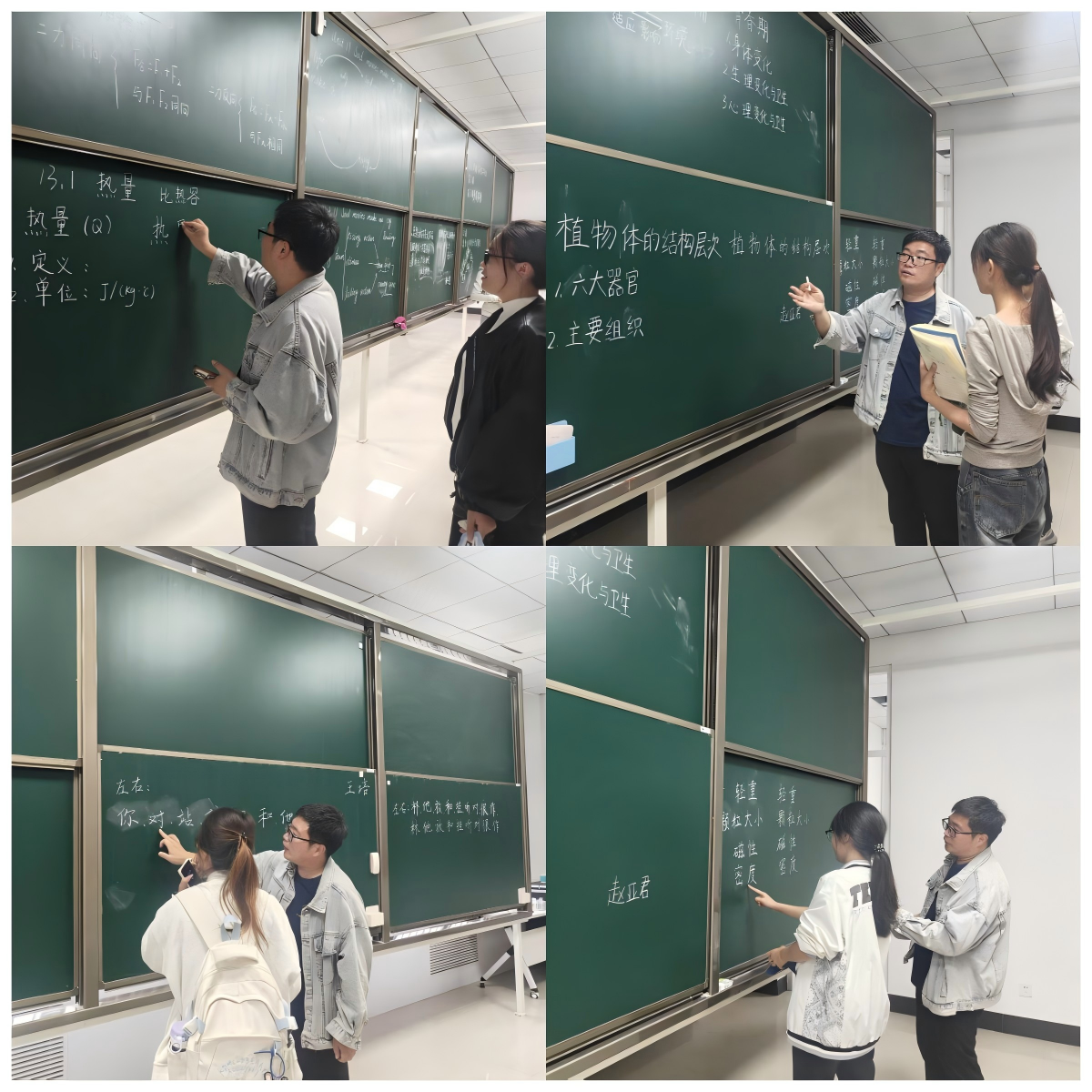 理论讲解结束后,王文博老师带领学员前往汉梁楼115-粉笔字板书实训室开展实践教学。学员们以微型课教学场景为背景,在黑板上设计并书写教学板书;王文博老师逐行查看、逐字点评,针对笔画力度不足、板书布局松散等问题提供一对一指导,同时结合整体板书的逻辑性与视觉效果给出优化建议,助力学员提升板书设计的实用性与美观度。期间,他还特别关注即将参加河南省第二十三届高等学校师范类专业毕业生教学技能比赛的选手,结合竞赛评分标准,从板书主题契合度、字体规范性、色彩搭配合理性等方面提供专项指导,为学员备战竞赛精准赋能。